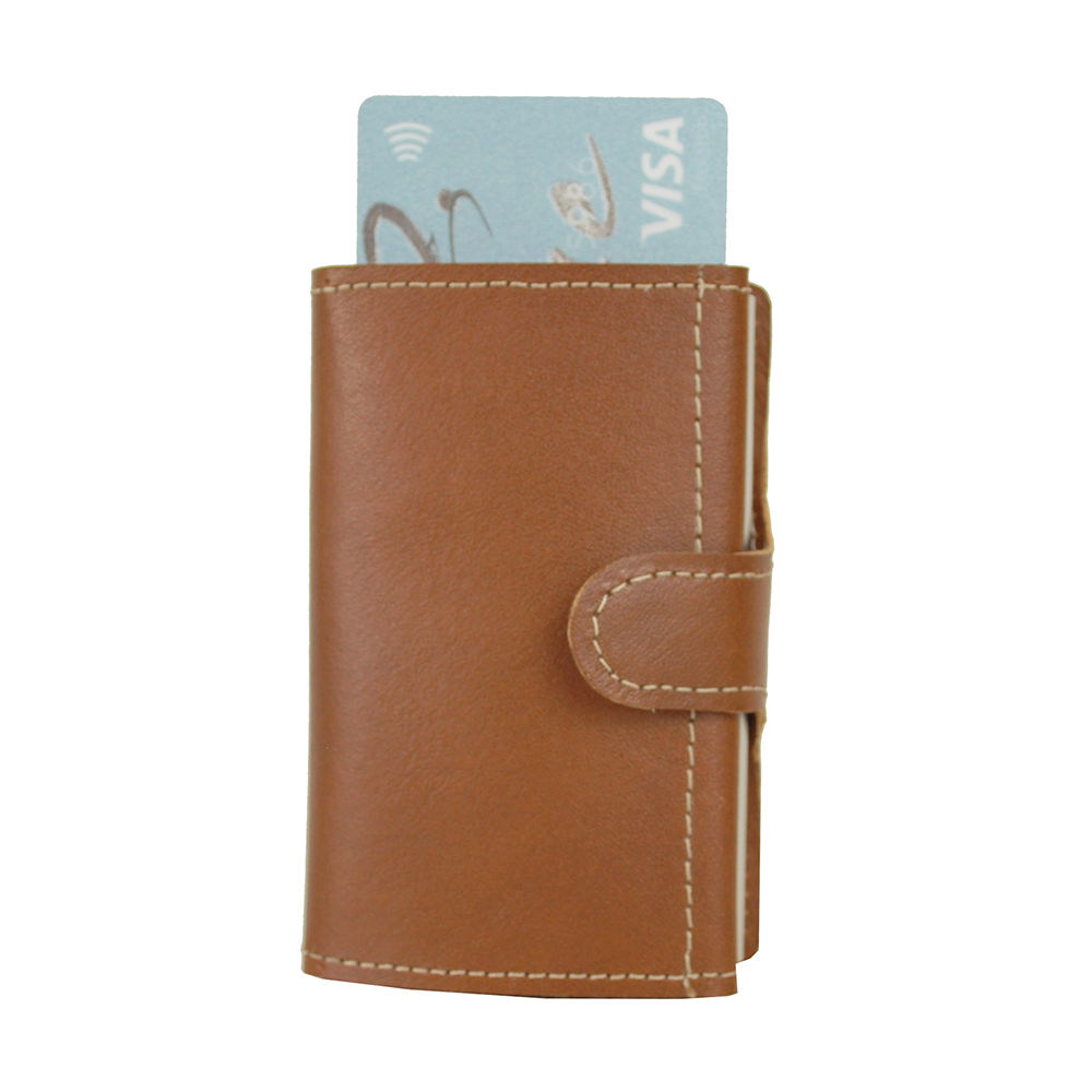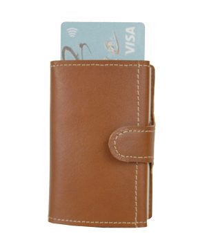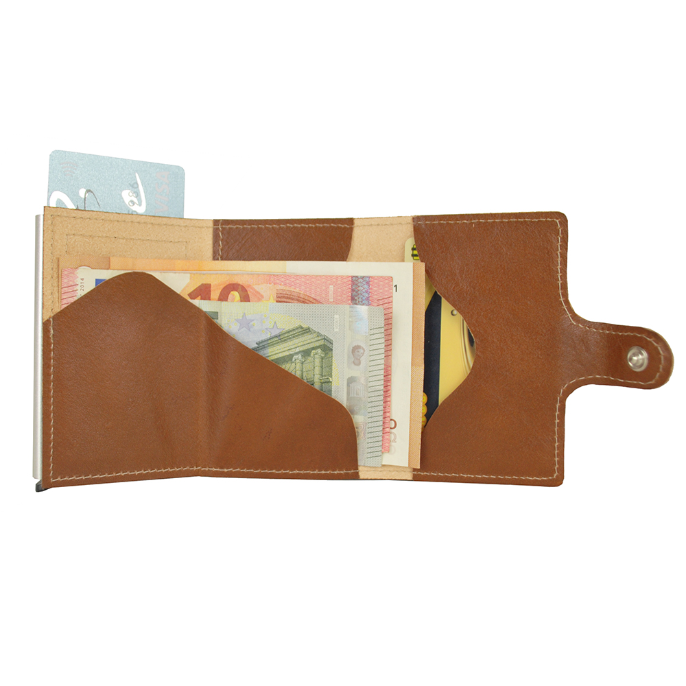 Kožená peňaženka SIMPLE s RFID patentovaným mechanizmom. RFID kožená peňaženka SIMPLE obsahuje 1x patentovaný mechanizmus, ktorý umožňuje vysunúť karty jedným jednoduchým pohybom, ktorý je pripravený na okamžité použitie. Hliníkový kryt chráni pred ohýbaním, rozbitím a nežiaducou bezdrôtovou komunikáciou.