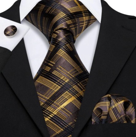 Kravatový set s vreckovkou a gombíkmi so zlato-čiernym vzorom