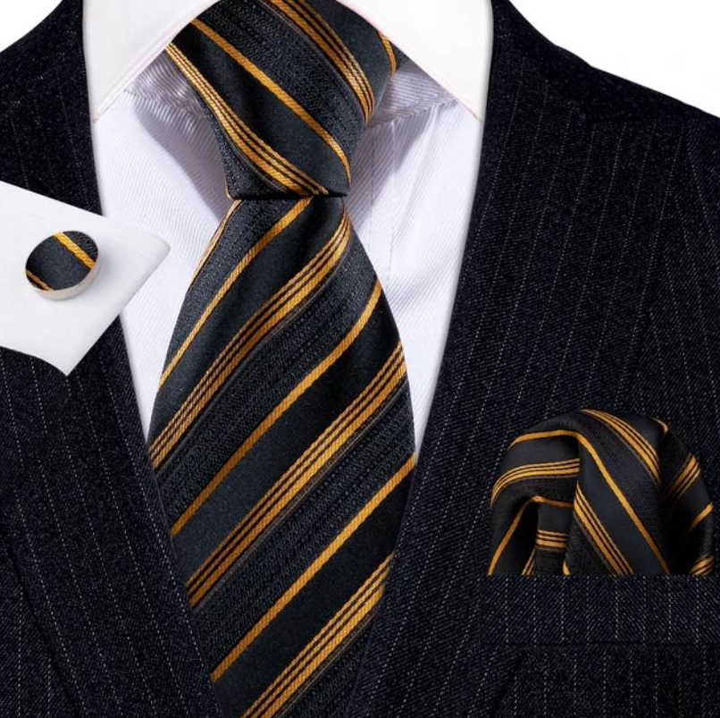 Kravatový set so zlatými pásikmi s vreckovkou a gombíkmi