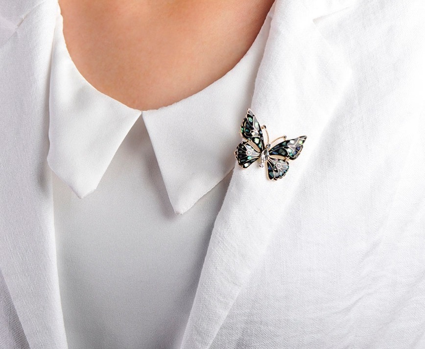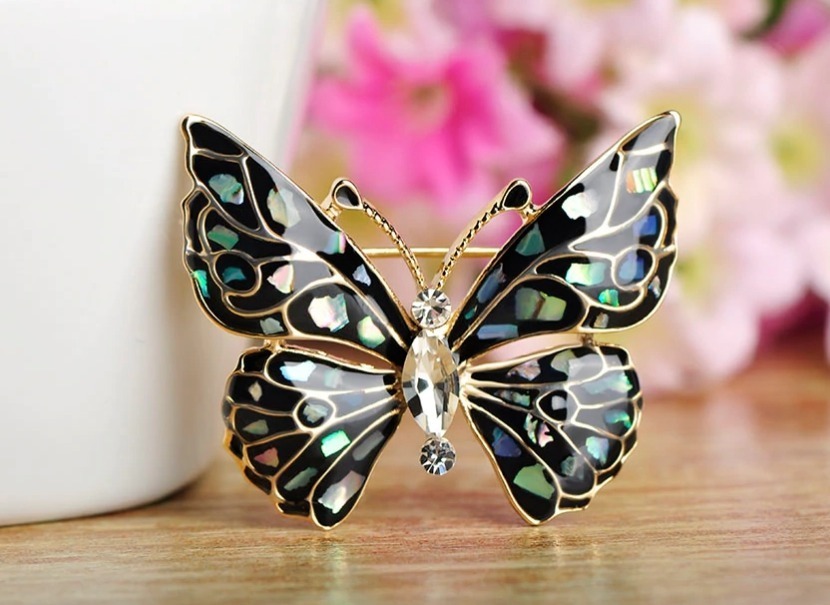 Luxusná brošňa na šaty v tvare čierneho motýľa zo smaltu je jedna z najluxusnejších brošní z nášho sortimentu. Je spracovaná technikou smaltovania čo zaručuje jedinečnosť a dokonalú krásu.