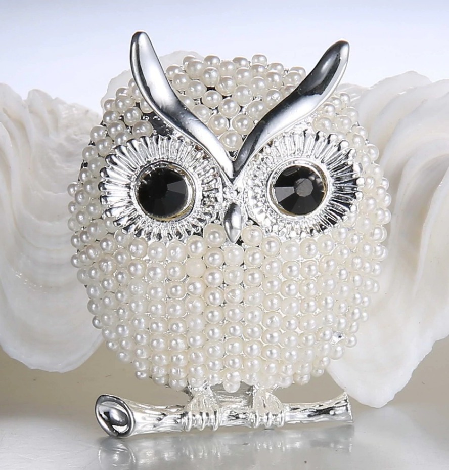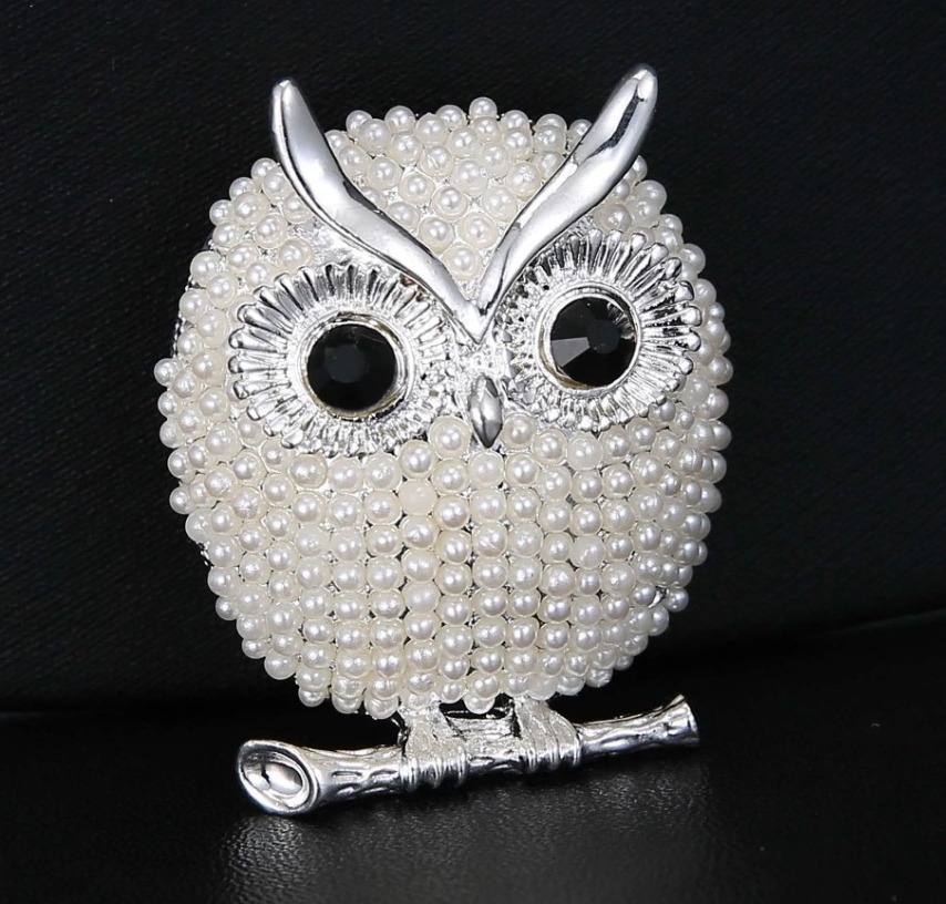 Luxusná brošňa s perličkami v tvare sovičky – strieborná