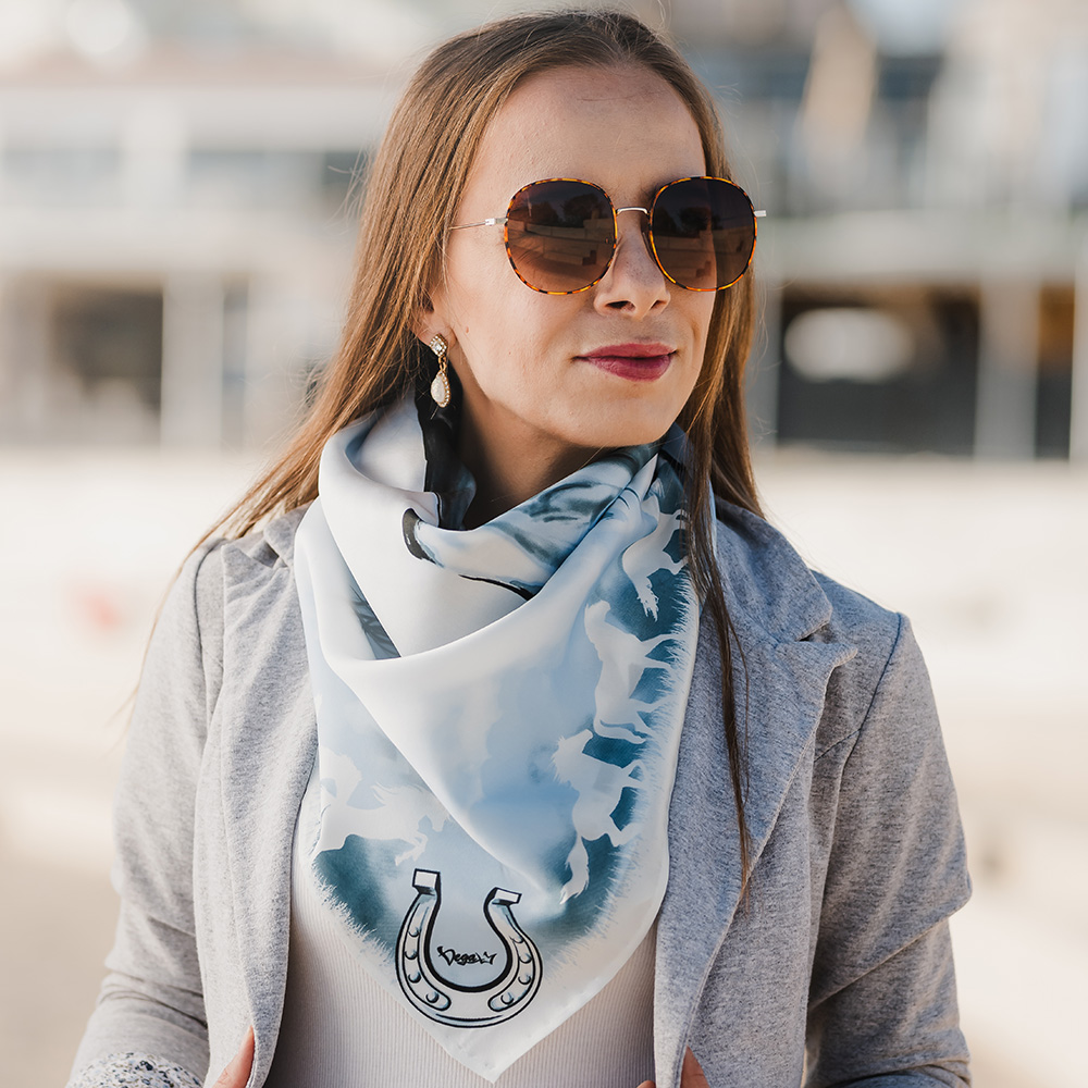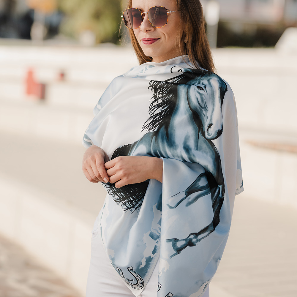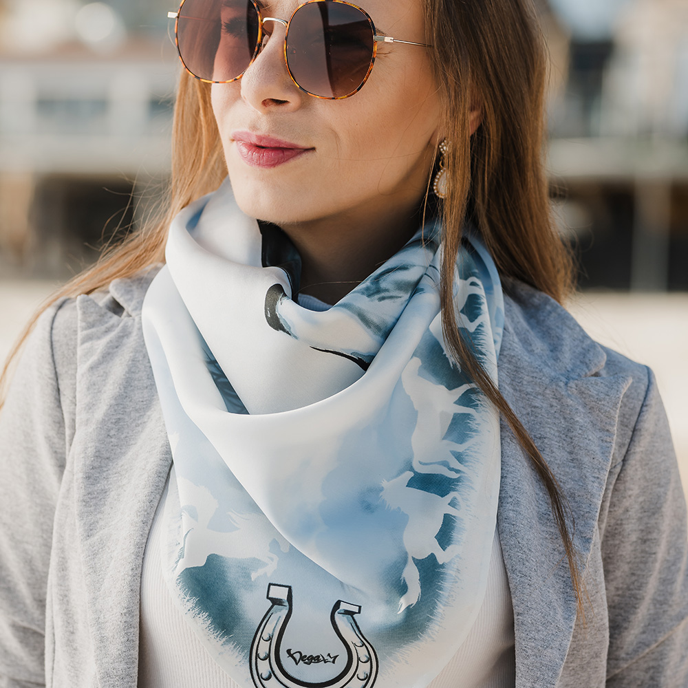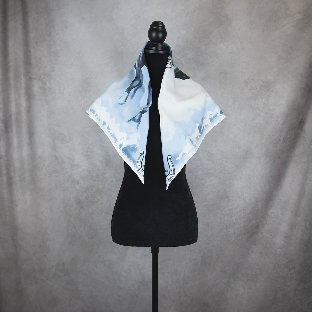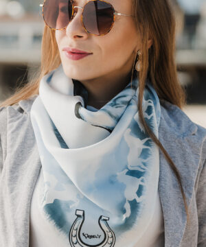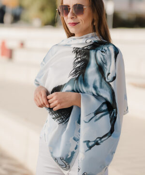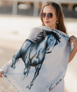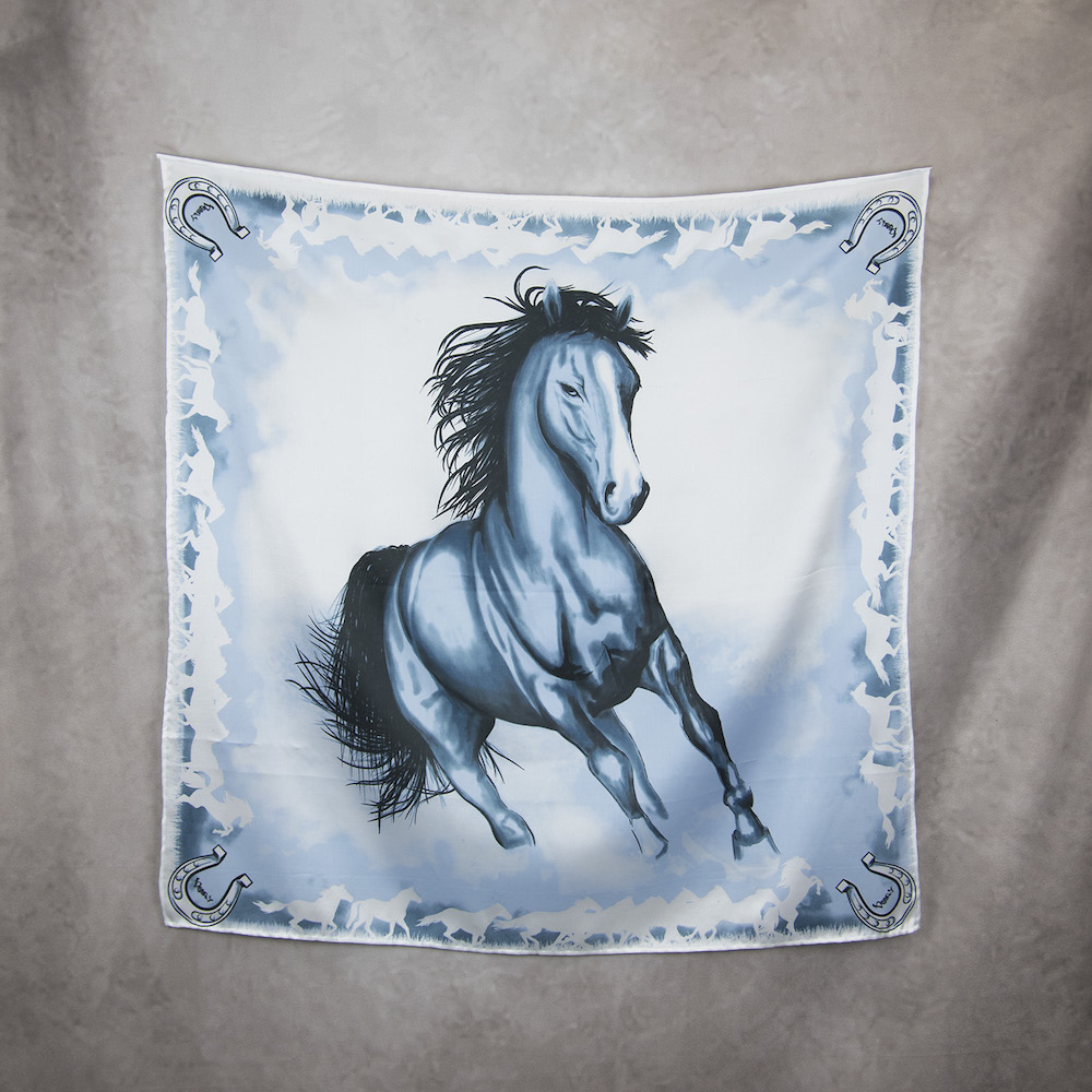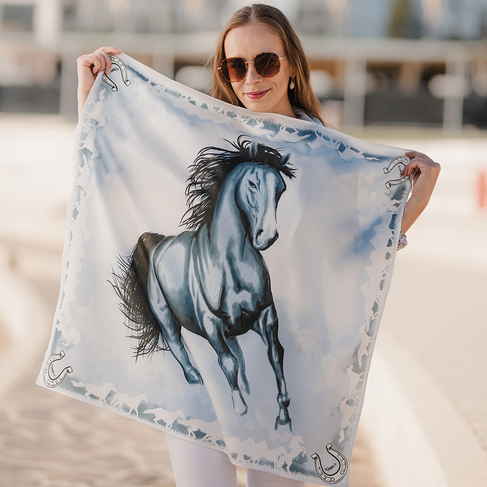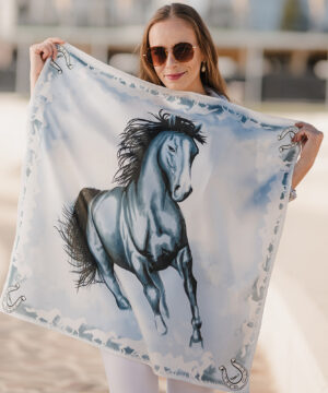 Luxusná hodvábna šatka Kôň – modrý, Vyrobené na Slovensku, 90 x 90cm