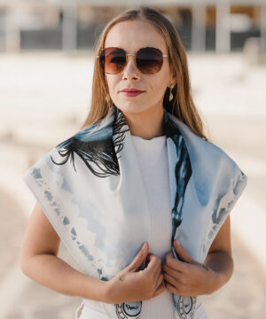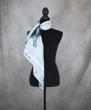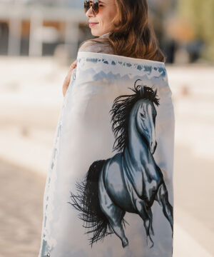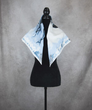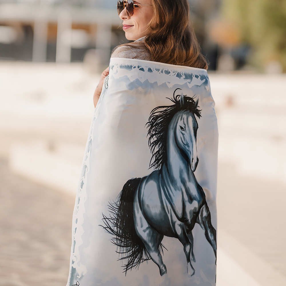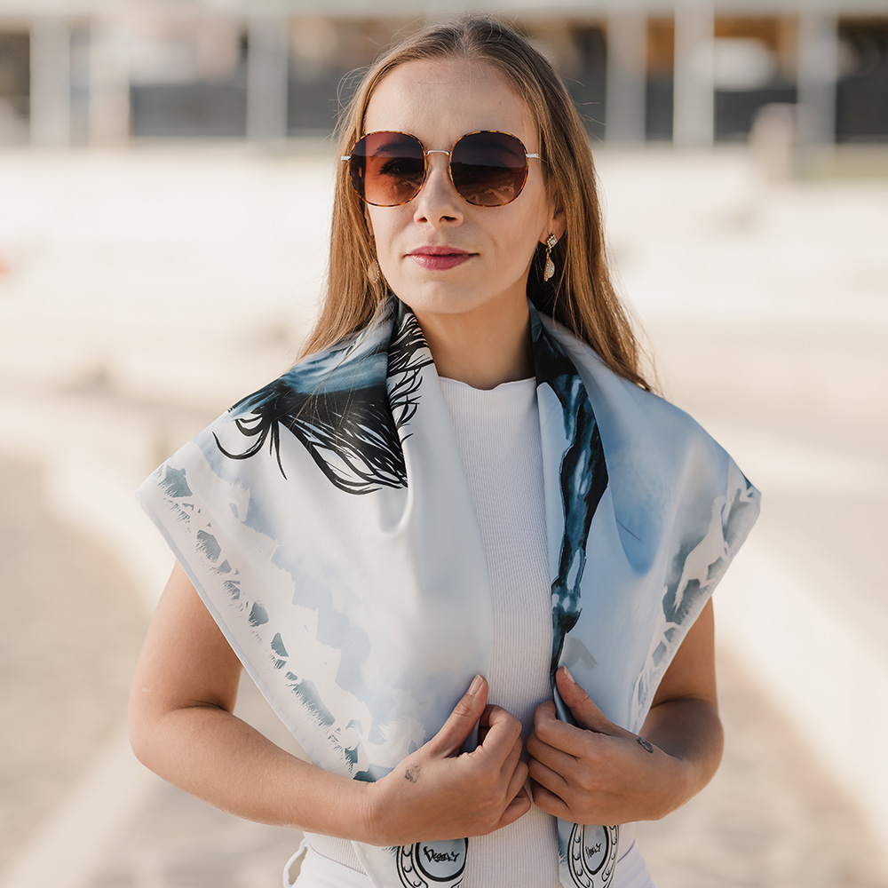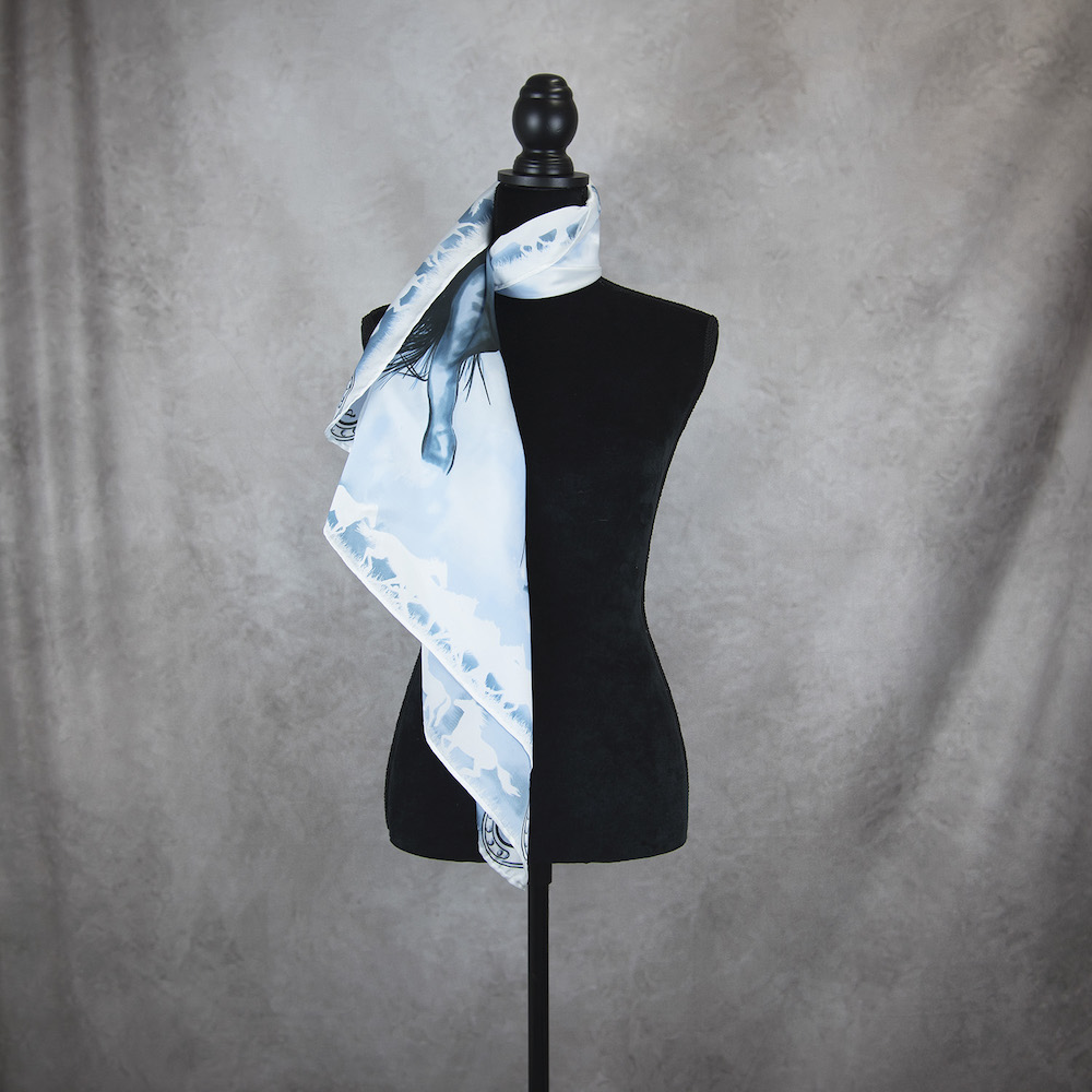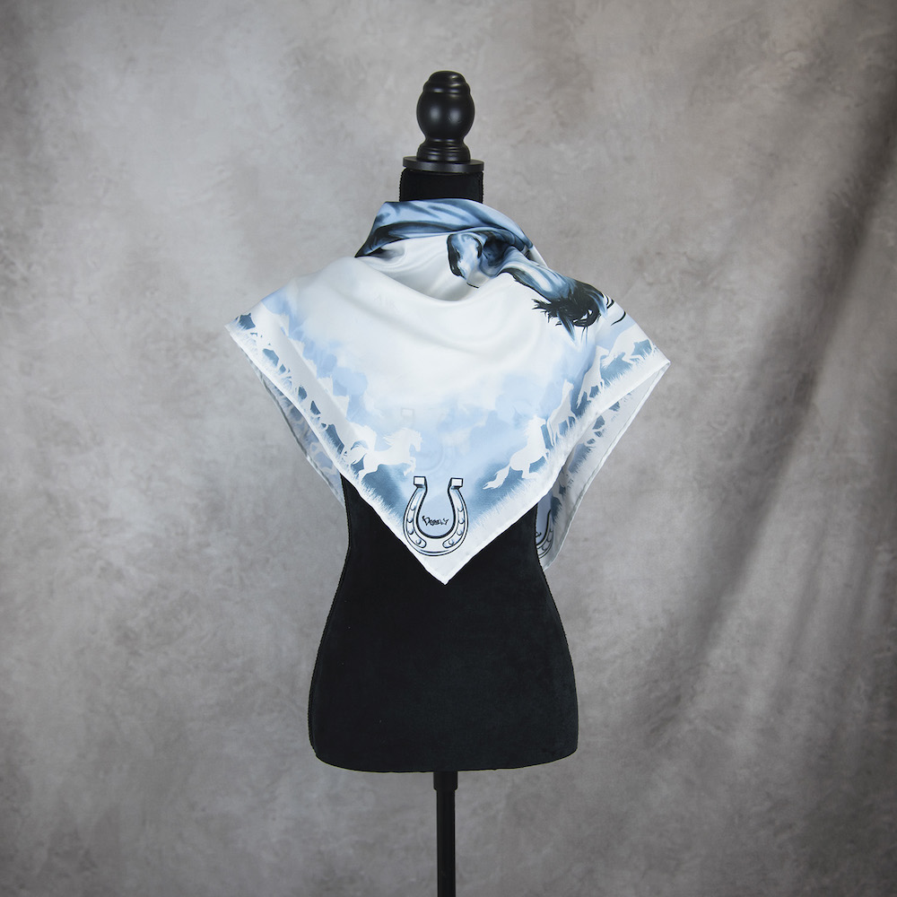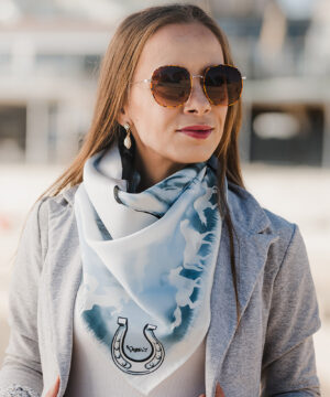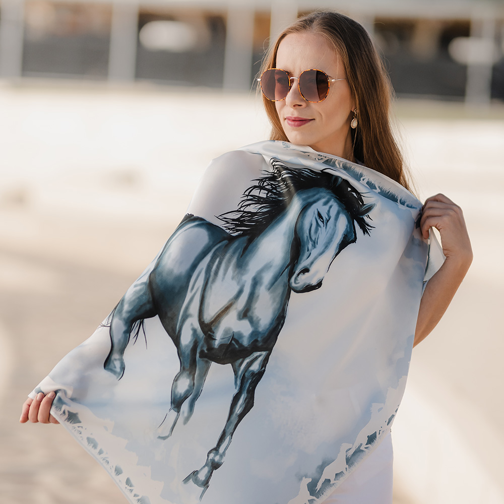 Luxusná hodvábna šatka Kôň – modrý, Vyrobené na Slovensku, 90 x 90cm