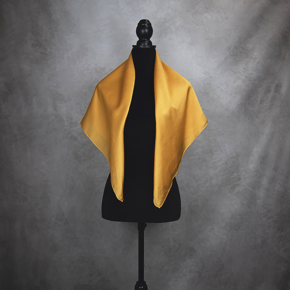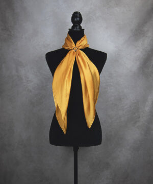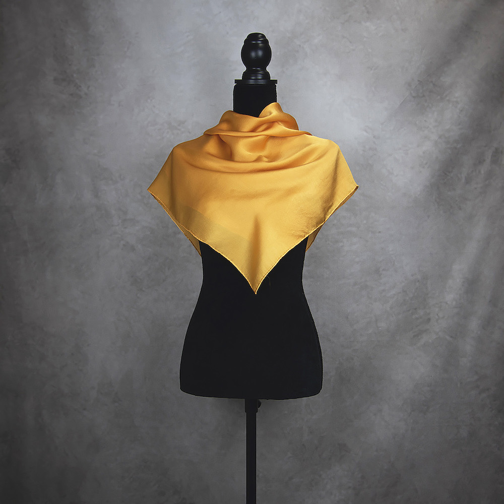 Postup tvorby: Šatka je farbená špeciálnym spôsobom, 100% prírodným pigmentom určeným priamo na farbenie hodvábu. Farba je zafixovaná, šatka vypratá a ošetrená fixátorom farieb. Okraje sú ručne zrolované a ručne prešité a následne je celá šatka vyžehlená.