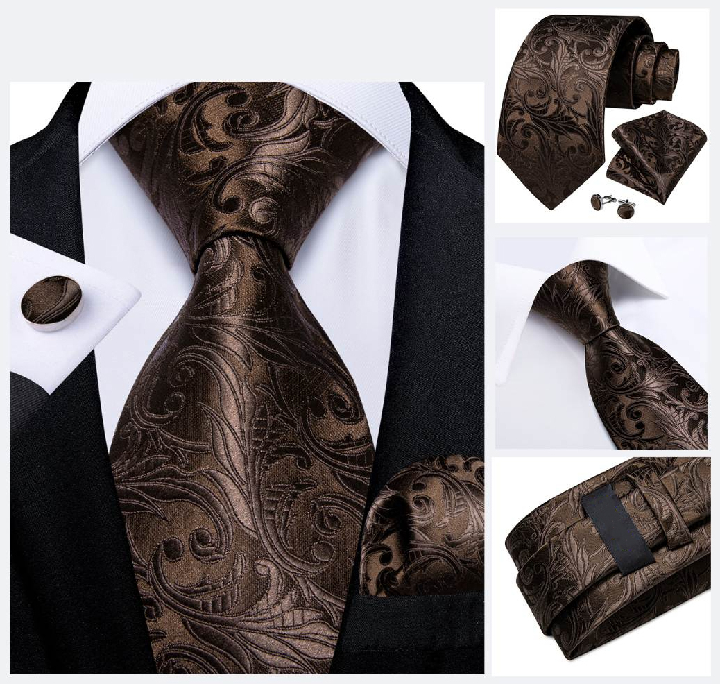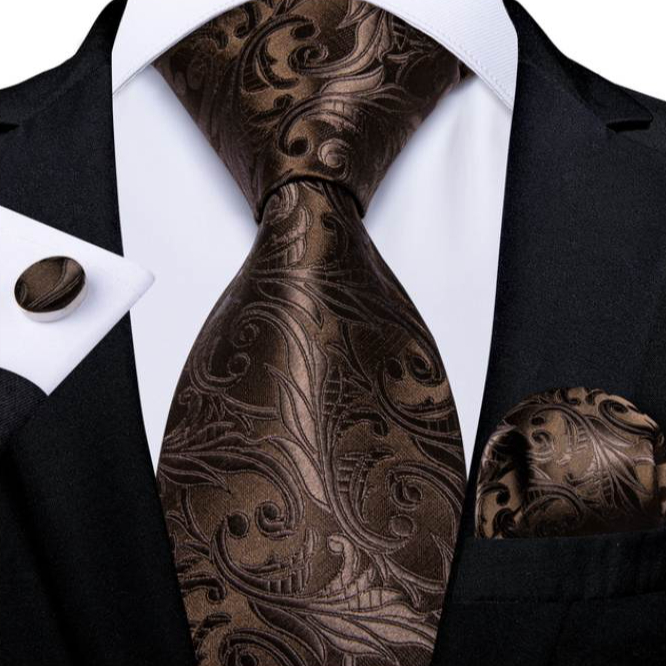 Luxusná kravatová sada v hnedej farbe – kravata + manžety + vreckovka