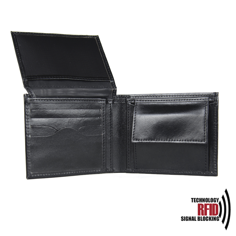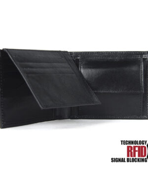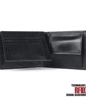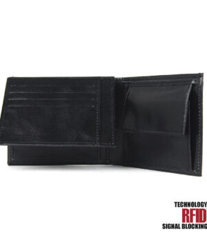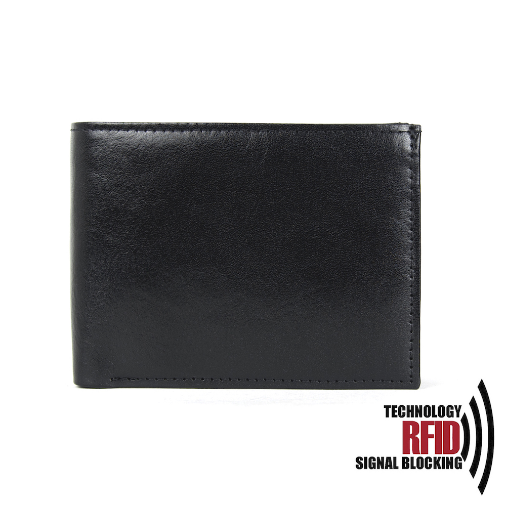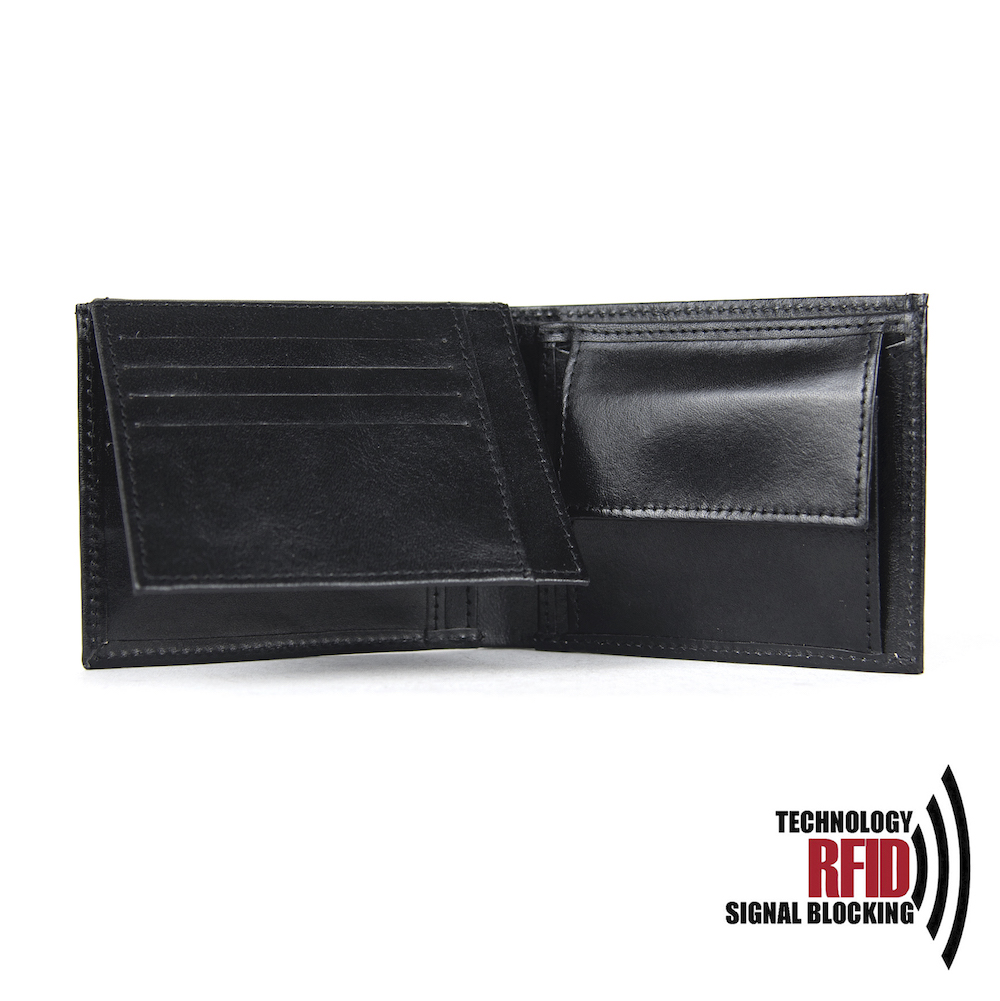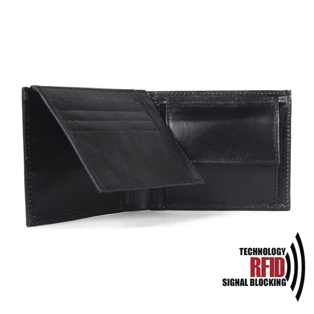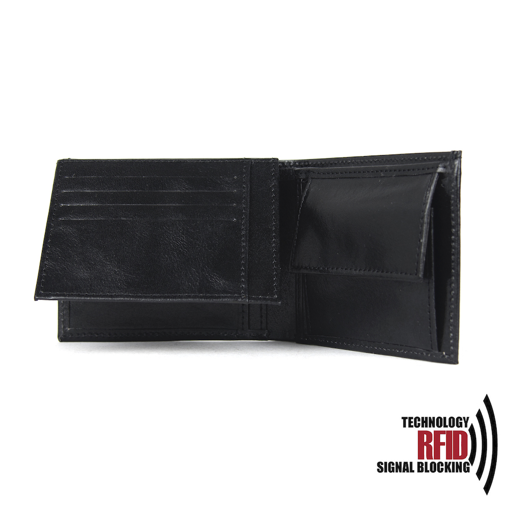 Ochranná kožená peňaženka v čiernej farbe. Táto luxusná kožená peňaženka vám zabezpečí bezpečie pred neopraveným oskenovaním Vašej kreditnej alebo debetnej karty. Peňaženka je v elegantnom vzhľade vyrobená z pravej talianskej kože. Podšívkový materiál v priehradkách na karty tvorí špeciálny materiál z kvalitnej hliníkovo-polymérovej zlúčeniny.