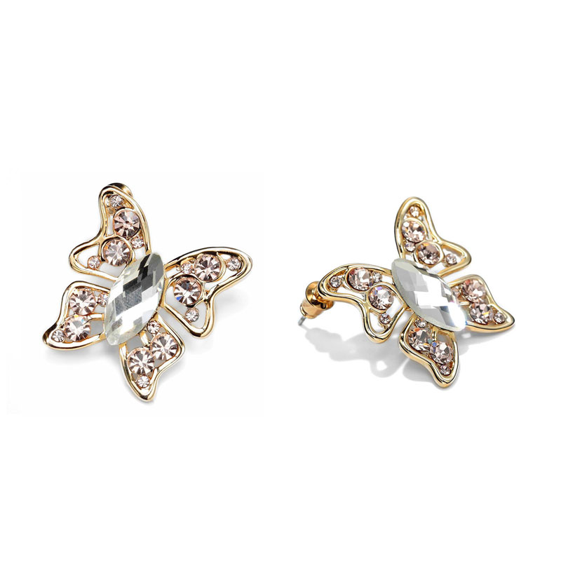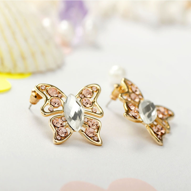 Luxusné náušnice v tvare motýľov s broskyňovými kryštálmi. Tieto krásne a elegantné náušnice Vás uchvátia svojim farebným vzhľadom. Motýľ je symbolom kreativity a slobody. Taktiež je aj symbolom radosti a farieb. Náušnice obsahujú žiarivé broskyňové kryštály a sú vhodné na formálne aj neformálne udalostí. Telo náušníc je v zlatej úprave. Luxusný a kvalitný materiál, dodáva náušniciam prekrásny lesk a žiarivosť. Sú vyrobené z kvalitných zliatin materiálov. Potešte svoju milú týmto romantickým darčekom.