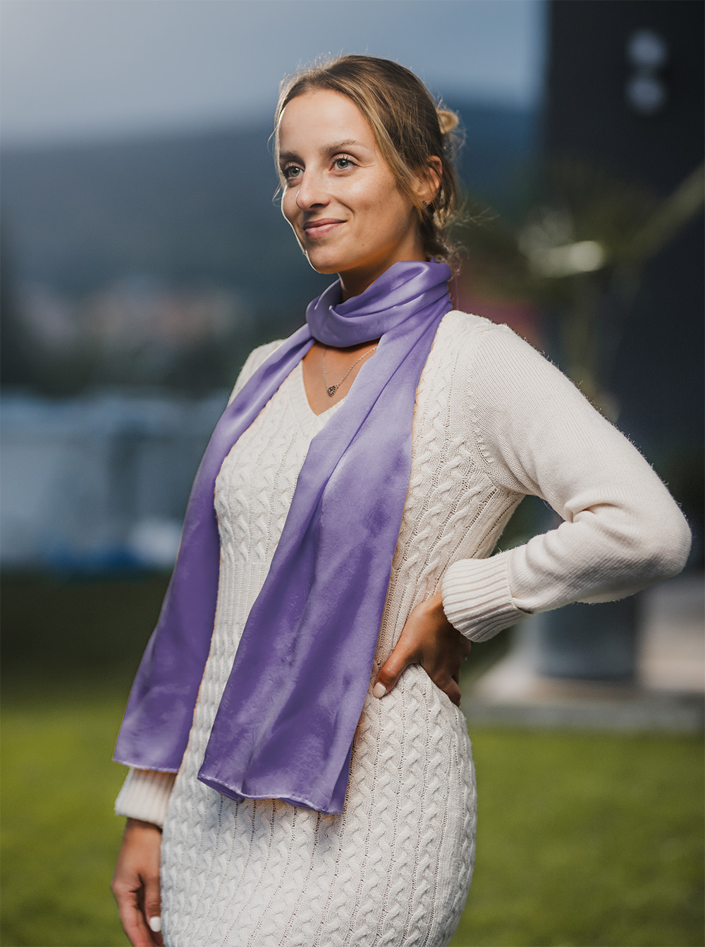 -klasický šál okolo krku – vďaka vlastnostiam hodvábu je vhodné nosenie celoročne