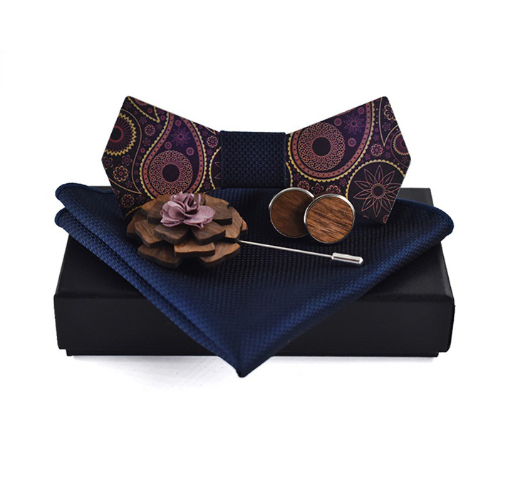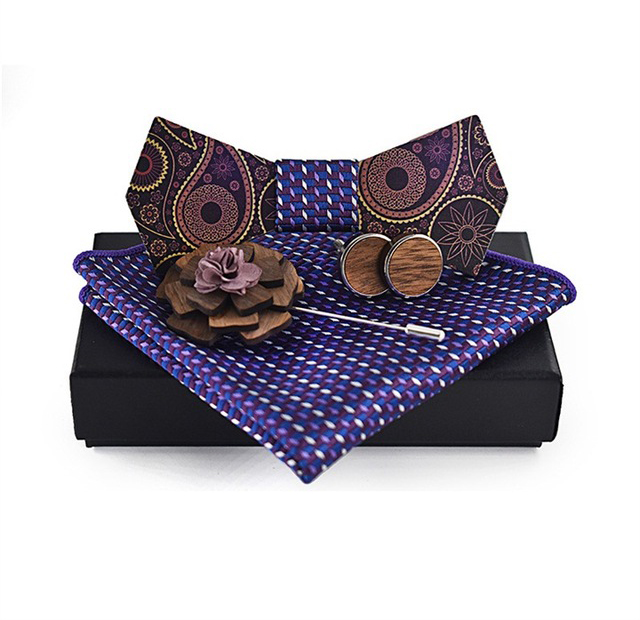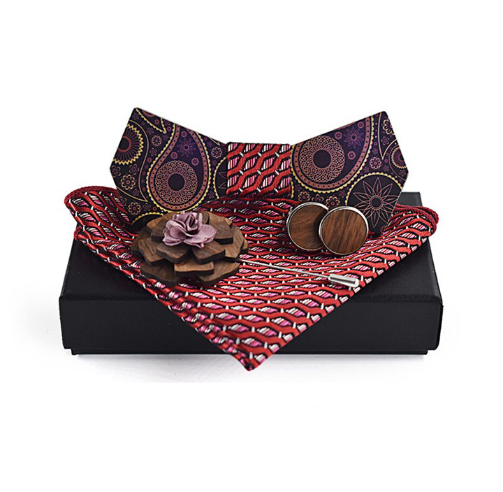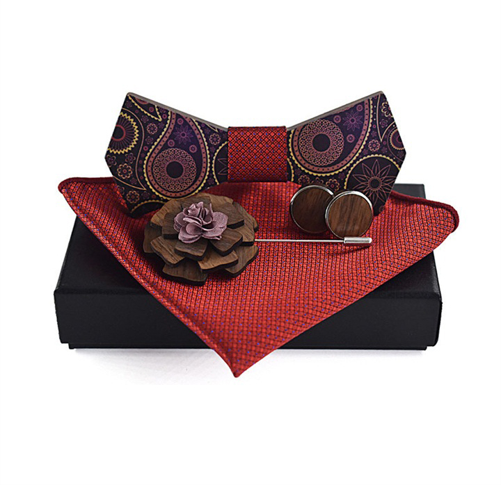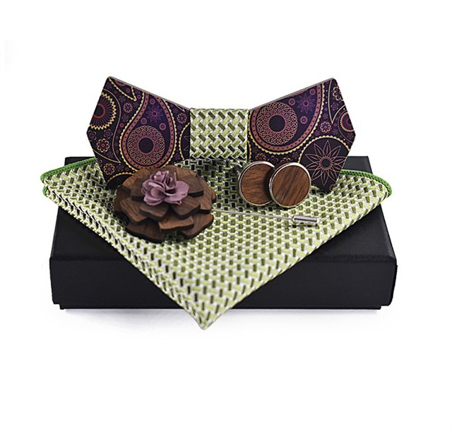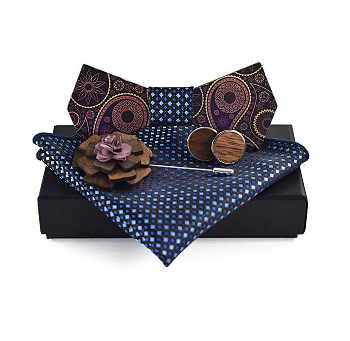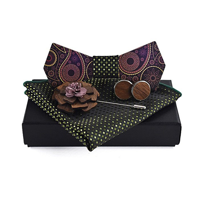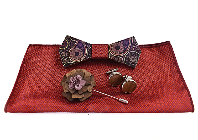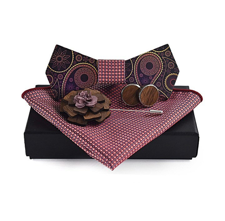 Luxusný motýlikový set v rôznych farbách – drevený motýlik+ manžety + vreckovka + brošňa