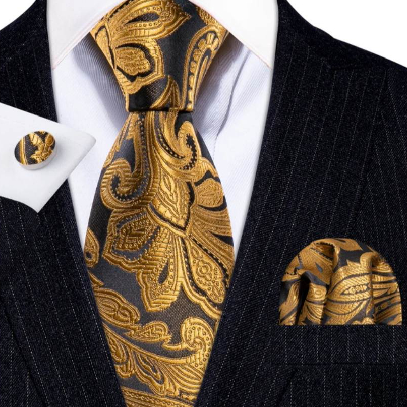Sada s kravatou, vreckovkou a gombíkmi so zlatým ornamentom
