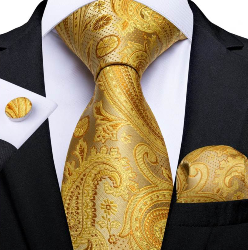 Sada s kravatou, vreckovkou a gombíkmi v zlatom dizajne