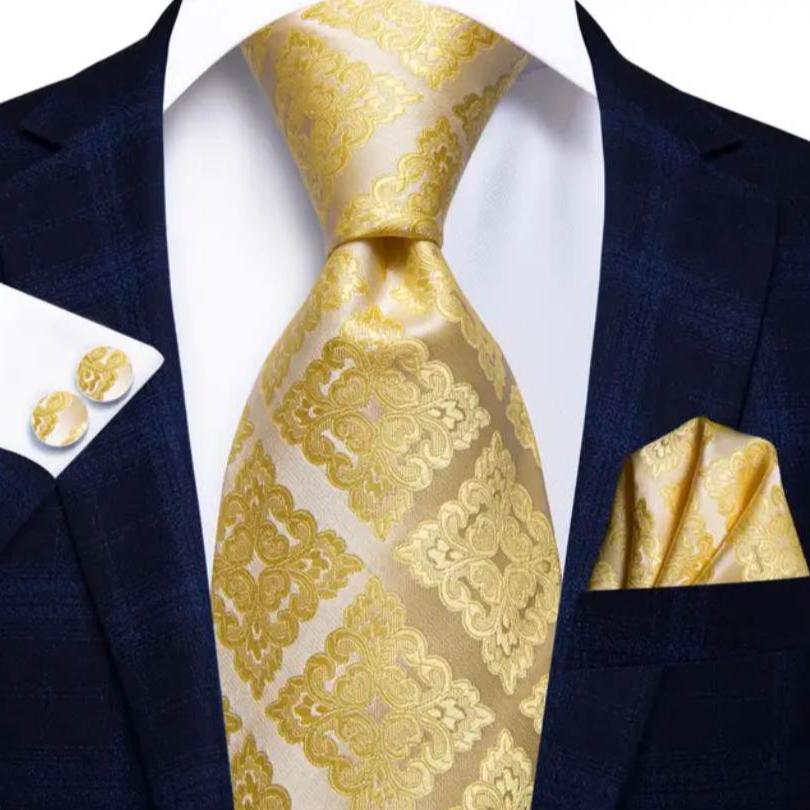 Zlatá vzorovaná kravatová sada – viazanka, vreckovka a gombíky
